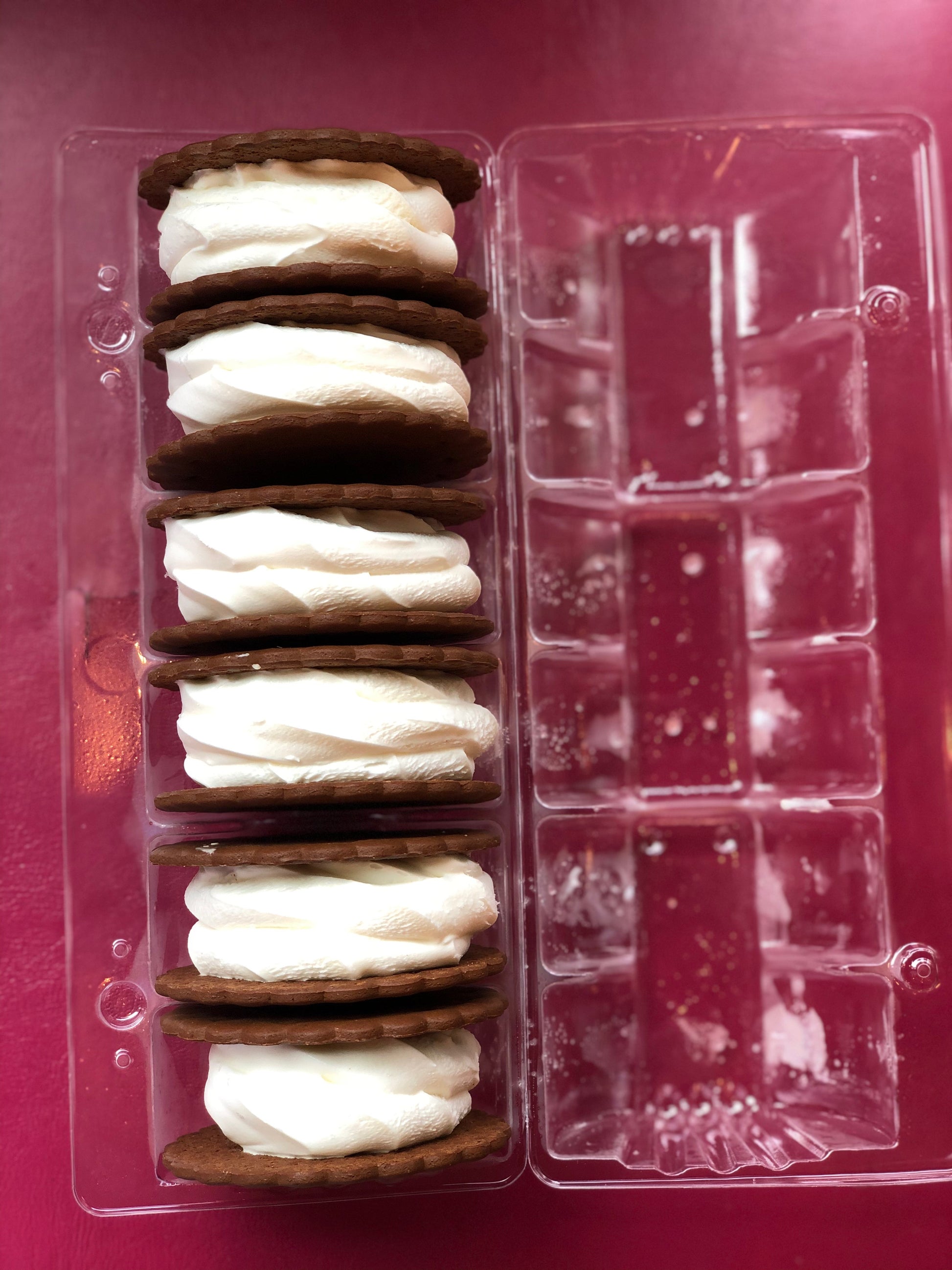 Each sandwich begins with a chocolate wafer cookie and a swirl of soft serve nestled and gently pressed together with the second cookie to create that iconic, joy-filled “sandwich.” You can leave it classic or roll it in sprinkles for an extra pop of joy!