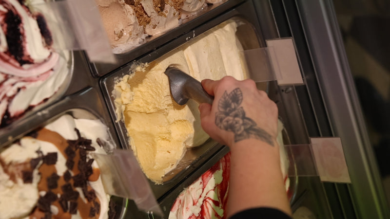 Our ice cream is made in-house from scratch, using recipes perfected over generations — and it all begins with sourcing! We handpick quality ingredients, from sun-ripened fruits to rich chocolates and warm spices. Each flavor has its own story and its own path — like our Strawberry, where fresh strawberries are prepped and pureed in-house to create a naturally sweet base.
